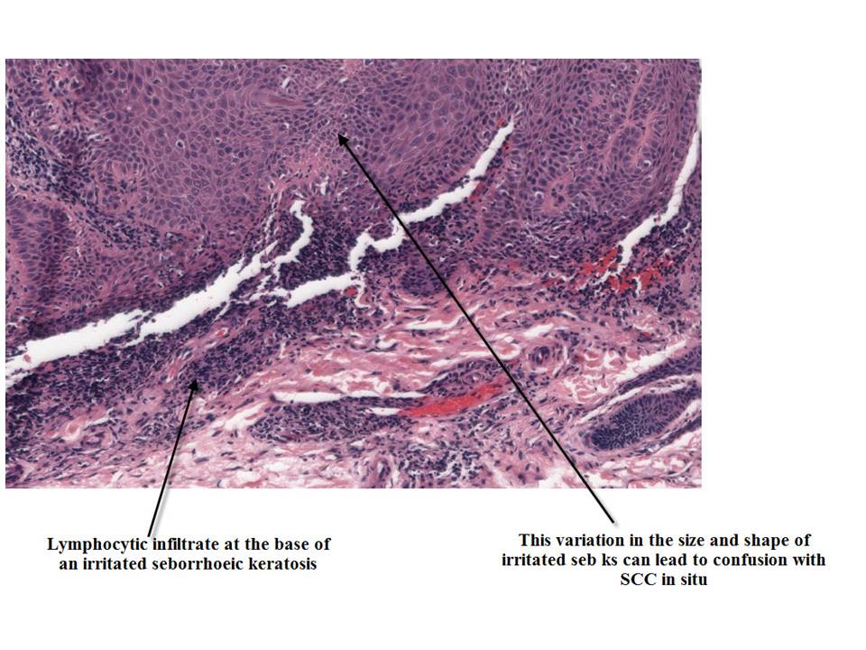 The variants architecturally of Seb ks include acanthotic, hyperkeratotic, clonal and reticulated. These can also be irritated or inflammed. Irritated seb ks show structures called squamous eddies while inflammed show a lymphocytic infiltrate around them. A melanoacanthoma is a deeply pigmented vaiant of a seb k made up of keratinocytes and dendritic melanocytes.